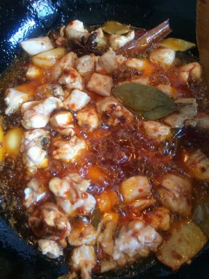 下入处理好的鸡肉块和土豆块,翻炒,虽然已经熟了但炒制时间依旧别太短,为了让土豆鸡肉吸收辣味