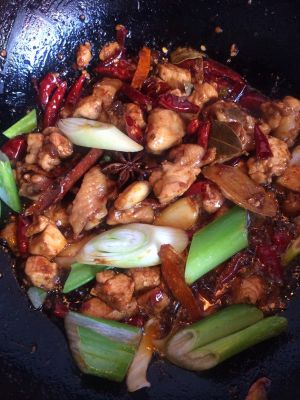 锅里倒油,放入红尖椒,花椒爆香后捞出,放入鸡块翻炒至金黄,放入胡椒面,孜然粉,盐,少许酱油,辣椒面。炒至表面焦黄即可出锅。