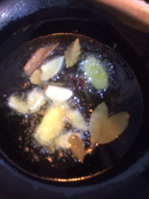 炸好,锅里留少量油,下八角,花椒,姜葱蒜,小火爆香