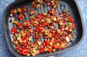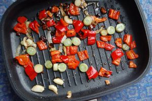 重起油锅,入花椒小火炸出香味,捞出花椒。(花椒开始变色即可捞起,炸久了会有苦味) 剩下的花椒油入干辣椒小火煎炸一会儿,倒入蒜末,大葱段和红辣椒丁中火爆香。