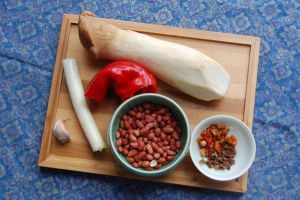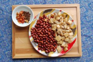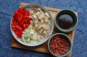 杏鲍菇洗净后蒸10分钟,关火晾凉。花生用水冲洗一下,红椒洗净切小丁。蒜切碎。大葱切小段。杏鲍菇切小丁,挤去水分,加少量盐,淀粉抓匀腌制5分钟。另取小碗,1勺生抽,老抽少量,1勺醋,半勺糖,适量盐,1勺淀粉,1勺清水调成调味汁备用。