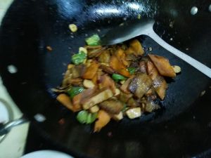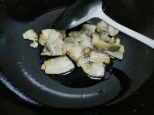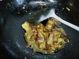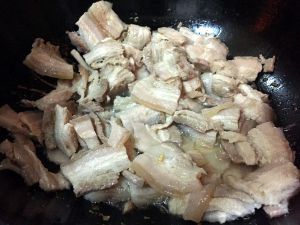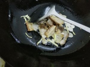 炒至肉片肥油基本煸出,肉片边缘变黄卷曲(如果花肉肥,煸出的油多一定要倒部分出来,一是为健康计,二是油多影响口感。倒出的油可以炒菜或煮面条,不浪费的),下入姜蒜炒香。