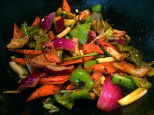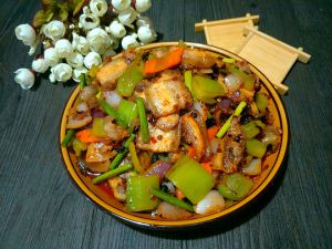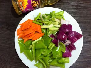 青蒜洗净切小段,洋葱洗净切丝,胡萝卜洗净切菱形块,青椒洗净去籽切块