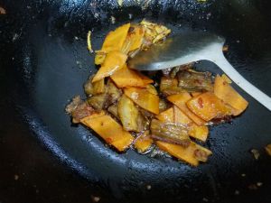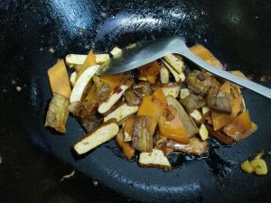 再下入一勺豆瓣酱炒出红油,然后加点老抽上色。
