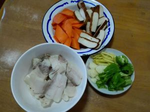 将五花肉洗净放清水里,放两片姜,煮开,滴一勺料酒,煮至里外全熟无血水,捞起摊凉去皮切薄片。干子斜刀切片,胡萝卜不用去皮,洗净,斜刀切小段,再把小段切菱形片。姜切粗丝,蒜切片,青椒切开去籽切小块。