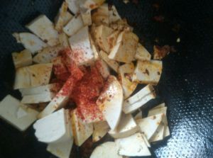 放入辣椒粉和麻椒掂锅,用筷子顺便翻豆腐也可以