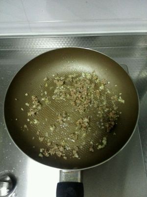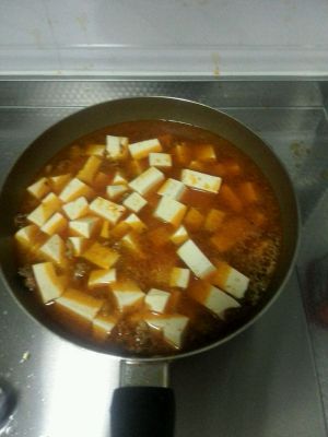 下油把肉末,泡椒,泡姜,豆瓣酱炒香,然后加少量水,下盐,味精,豆腐