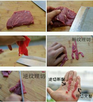 再顺着牛肉的纹理切成5-6厘米长,3mm左右宽的丝
