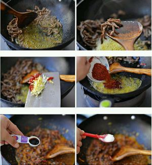 热锅放油,烧至四成热,放入牛肉丝煸炒,直到牛肉丝水分炒干,锅底的油变清时(这个过程很神奇,耐心等待,油一定能变清)加入豆瓣酱炒出香味。
