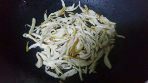 炒锅少油干煸杏鲍菇,煸成微焦即可,盛盘待用。
