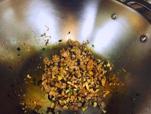 蒜蓉葱段炒爆香 然后下肉末炒至发白 下香菇炒到出味 然后下调料