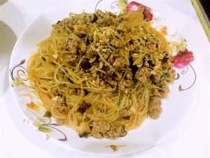 油锅下葱姜蒜干辣椒爆香,下肉糜炒香发白,下泡软的粉丝,加酱油、蚝油继续炒,再加少量水煮,直至收干水分,撒上葱花,装盘即可