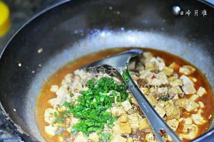 过程图确实没有了,最近做的时候没照,成品图是用的胆水老豆腐做的,锅里下油先炒香肉沫,再放入老抽及郫县豆瓣,姜蒜末放入炒香后倒入豆腐,可以稍微加一点点水进去闷豆腐,待快收汁的时候加入鸡精及花椒粉辣椒面,水淀粉稀释后倒入锅中勾芡,撒上葱花起锅装盘,一道麻婆豆腐就完成了。
