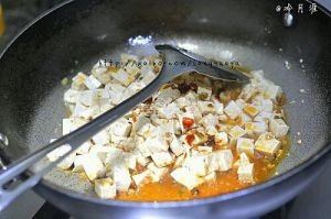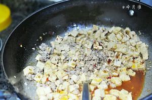 加入肉末翻炒至变色。加入豆腐。翻炒