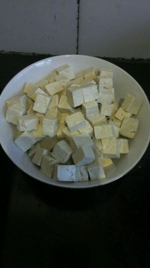 焯豆腐:豆腐切小块,开水下锅煮3分钟捞出备用(焯豆腐时可准备葱花、水淀粉)