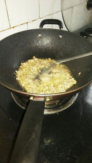 炒肉沫:锅里少许油,油热后将肉沫炒散,放一勺下豆瓣酱炒出红油,加入上一步骤的花椒末,加半小碗水烧开