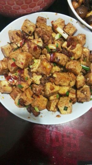 放入备好的豆腐翻炒,再放入老干妈,盐,翻炒即可。