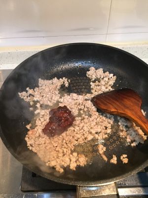 炒到肉糜变色后,加豆瓣酱,跟肉糜拌匀