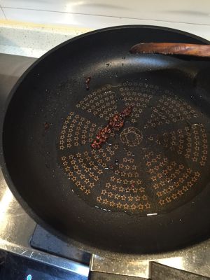 然后,加水,下豆腐,下辣椒,这里应该用新鲜红辣椒的,但是我没有,也懒得买,就放干辣椒了,也很好吃