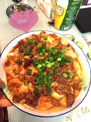 豆腐小心切小块加盐过水,文火开2分钟取出冷水飘冷。大火锅烧透,油淋锅,加冷油少量,这个一定要做到位。然后加蒜,干辣椒,花椒炒香,加糖少量,炒到微焦,加酱油,加水加豆腐、加盐味精鸡精。用大火烧开,换中火,加熬好的辣酱油,加牛肉,烧到水油分离。就是上面能看到油,加水淀粉加朝天椒粉,加麻椒。不停晃锅。淋入猪油,麻油少许,要沿着锅边淋,这样锅内的温度会马上上升,锅底慢慢出一种辣椒,花椒 ,豆腐和油的混合焦味,这是麻婆豆腐的香味精华,也是区别麻辣豆腐的地方。多烧几次就能掌握这种火候,然后换大火,加快晃锅,出微微的青烟立马出锅,洒上葱花就好了。