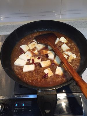 加一些水煮开,到入切好的豆腐再次煮沸,轻轻翻动几下。(用力翻动豆腐就碎了)