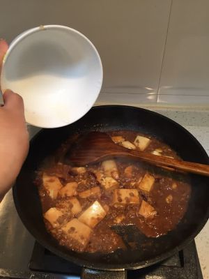 玉米淀粉加水拌均匀成芡汁,加入煮开的肉沫豆腐中,再次烧开煮到浓稠状即可(略糊状)