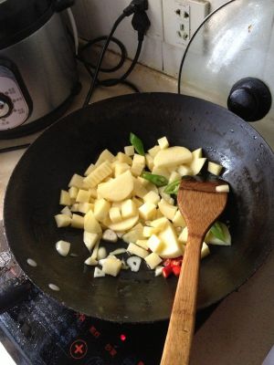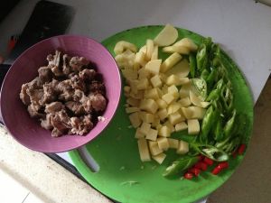 排骨先用开水绰一下,撇去浮末。辣椒土豆切丁,蒜切片,姜切丝,备用。