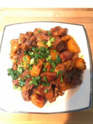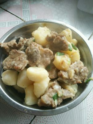 煮至排骨土豆熟透,加盐,生抽,味精,鸡精,葱。收汁出锅。