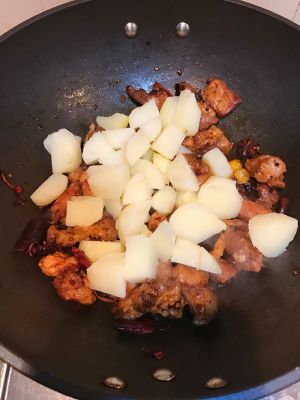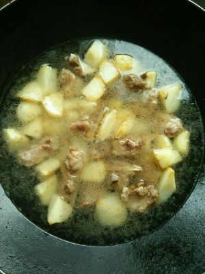 继续把油加热,倒入土豆,炒至土豆微黄,加入排骨翻炒。加水没过土豆排骨。大火烧开,转中火闷煮。
