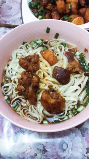 加了点在面条里做汤头,也很味美哦,喜欢吃鸡肉的亲们,可以把排骨换成鸡肉,小料再加入香叶和孜然粒,配料除了土豆加上青红椒和洋葱就是另一道美味-新疆大盘鸡,大盘鸡孜然粒要起锅前加入,不要煮太久。