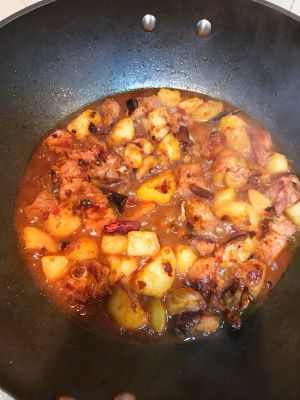 排骨香味出来后,加入煮好的土豆,土豆切的时候不要太小块,这样不容易煮烂,周末时间长的话,土豆不用先过水,这样小火慢炖的土豆会更入味,做菜时间会增加30分钟左右。