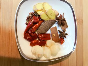 姜切片,大蒜拍扁,葱蒜切段,干辣椒少量