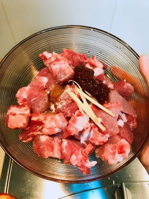 煮土豆的过程中,把排骨斩小一点,放一点豆瓣酱、白胡椒粉、料酒、姜丝腌制入味。