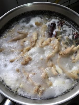 放入3片姜片花椒粒十几粒开锅后,撇去浮沫煮8-10分钟左右!这个时间太久做出来的凤爪就没有嚼劲,太短不熟,所以8-10分钟刚刚好哦