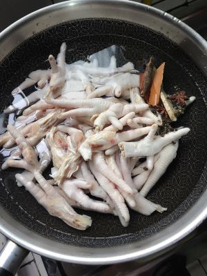 锅里倒入清水放些八角、生姜、小米椒,水沸腾、把凤叫放入锅中、放些生抽煮十分钟左右