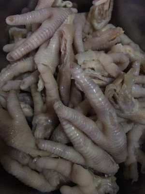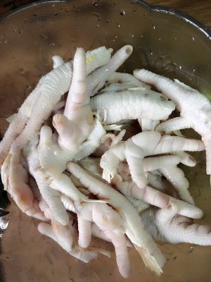准备洗干净的鸡脚!买的时候请商家把剪好了!要把指甲剪好!再从中间剪开!备用!