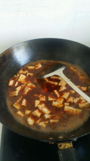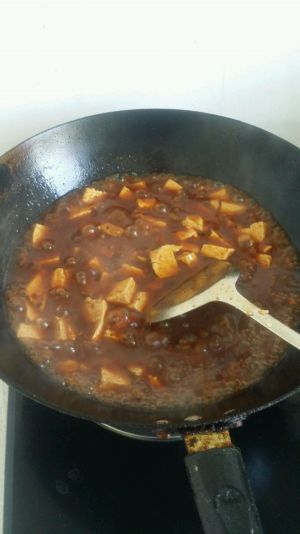 锅置小火入油 肉末 姜末 盐炒干水分再入料酒炒酥备用。改旺火入水 盐 豆腐焯水连汤一起倒出备用。