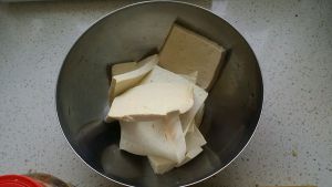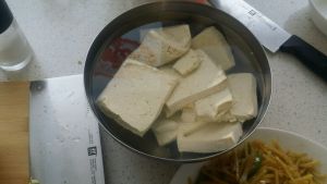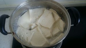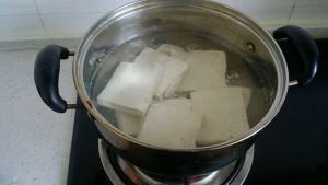 锅中加水放盐,将豆腐放入锅中,煮沸,去生豆腐味
