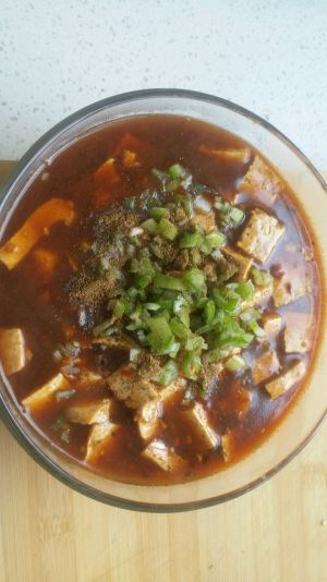 锅置小火入油 豆瓣 海椒面 炒香出色再入豆豉 豆腐 水 酱油改中火略烧加入蒜苗 鸡精 味精轻炒勾入水豆粉略收汁再勾入水豆粉收汁下去肉末改大火起锅装盘,撒上花椒面。