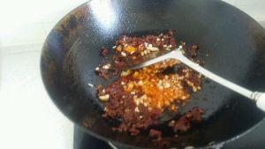 热锅放油,姜末跟蒜末下锅煸炒,炒出香味,然后肉沫下锅,放点老抽,倒入辣油,放点水,大火开煮