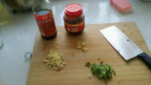 豆腐改方丁,蒜苗切节,豆豉切碎,姜切末,豆瓣剁茸
