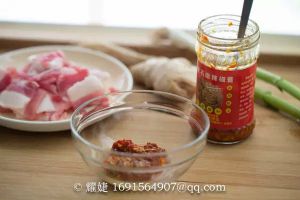 1、选用五花肉,或者用猪后臀肉俗称二刀肉。准备配料辣椒酱、青蒜。