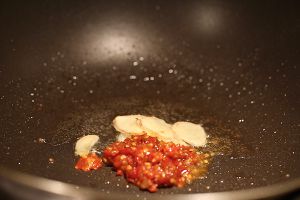 锅中留底油,放入姜片和泡椒酱,煸出香味。