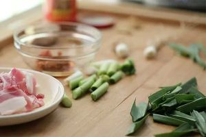 放入青蒜茎和肉片,翻炒片刻后放入青蒜叶,最后加入酱油和白砂糖调味即可。