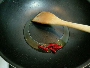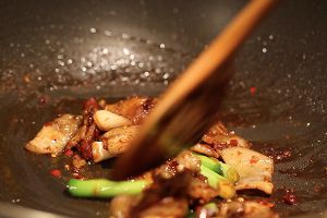锅里加入适量的油,油温起来之后,加入干辣椒,翻炒至辣椒变色,然后加入适量的郫县豆瓣,待豆瓣炒熟之后,加入事先切好的肉片进行翻炒。