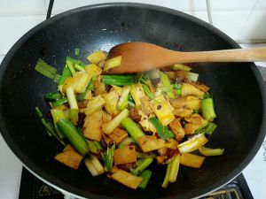 肉片炒熟之后,加入切好的豆腐和蒜苗,继续翻炒。直到蒜苗炒熟,最后加入适量的鸡精和盐就可以了。