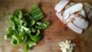 柿椒洗净切块儿,蒜切碎,煮熟的肉切片,备好待用。