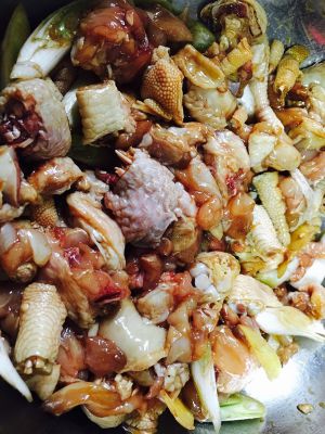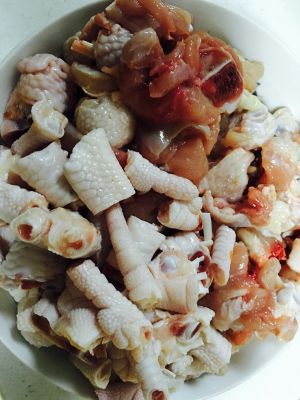 把买回来的鸡腿,鸡中翅,鸡脚砍成小块儿,越小吃着越入味儿
