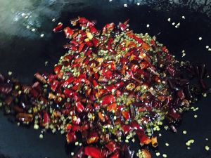 剩些油在锅里,先下蒜片和姜片,炸香以后下花椒和辣椒,超值香味出来