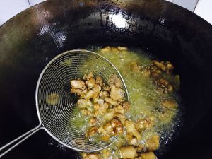 鸡肉下锅前加些生粉,锅里多下些油,油温达到八成热的时候下鸡炸,大火炸制外焦里嫩,表面发黄时可以捞起,锅中多的油倒出